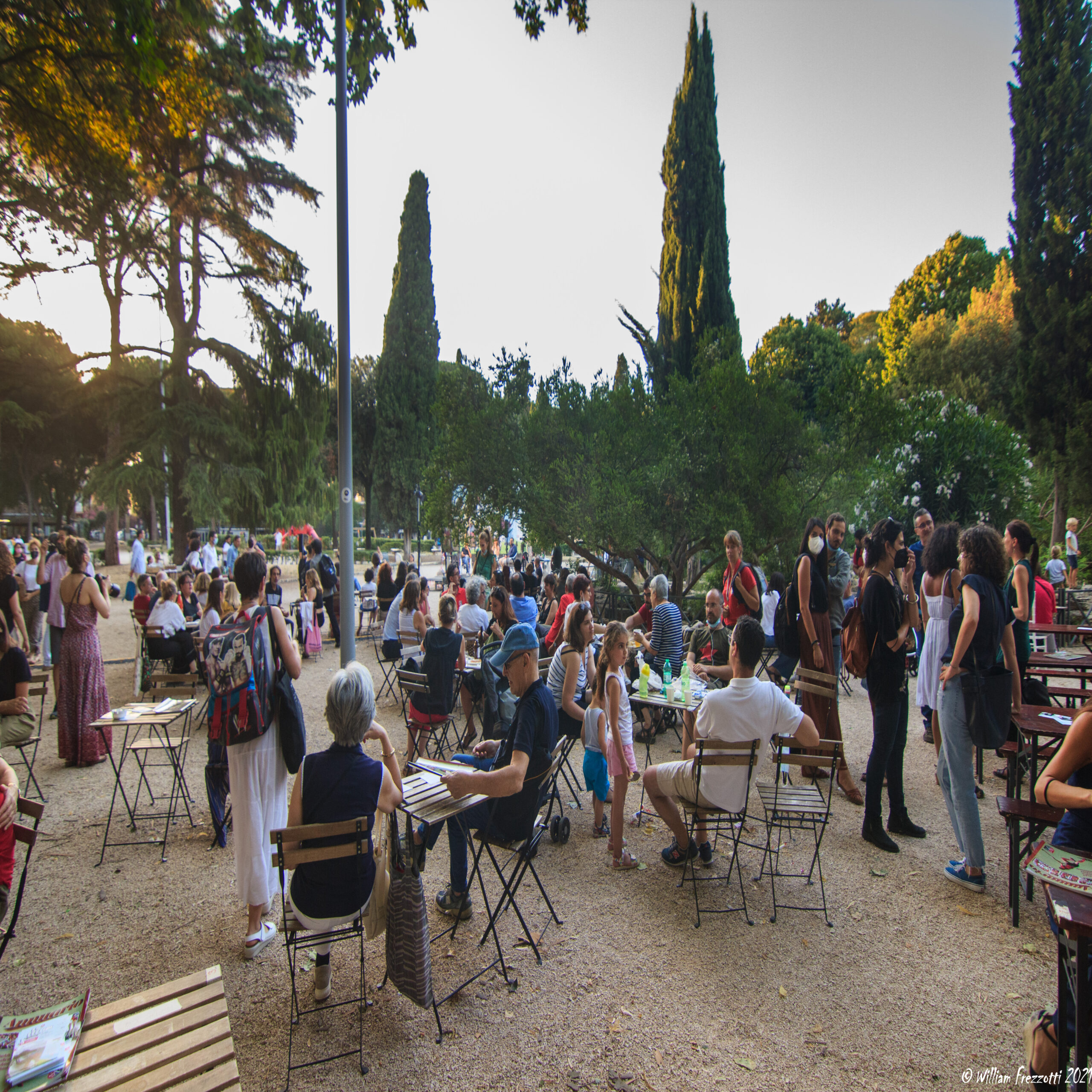 Il sole sta tramontando nel verde del Parco Nemorense. Una morbida luce color oro accarezza i volti delle persone che chiacchierano davanti ad un aperitivo mentre, sullo sfondo, i bambini schiamazzano e giocano a rincorrersi. Dopo tanto tempo sembra finalmente di vedere un germoglio di rinascita in questa calda estate romana.